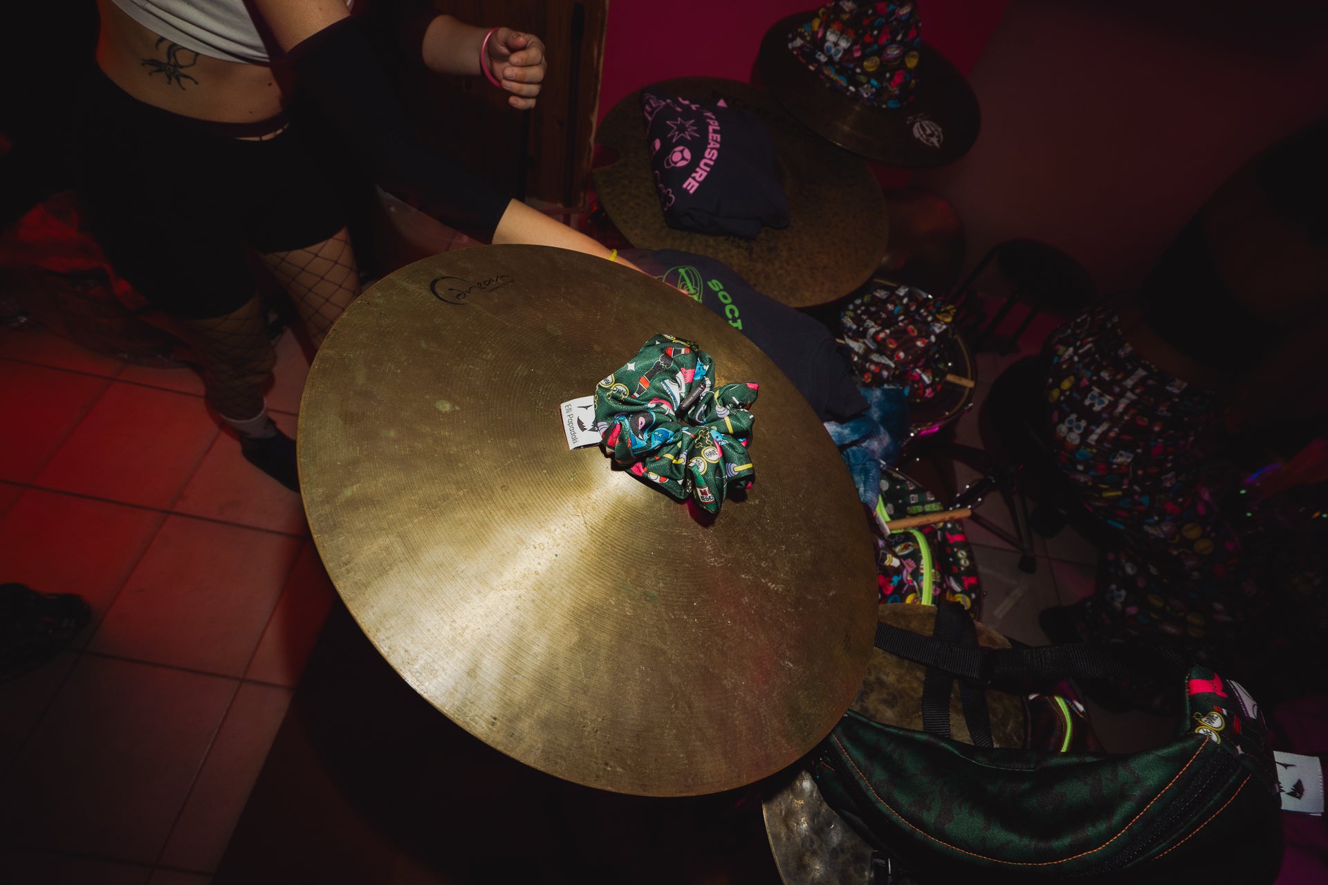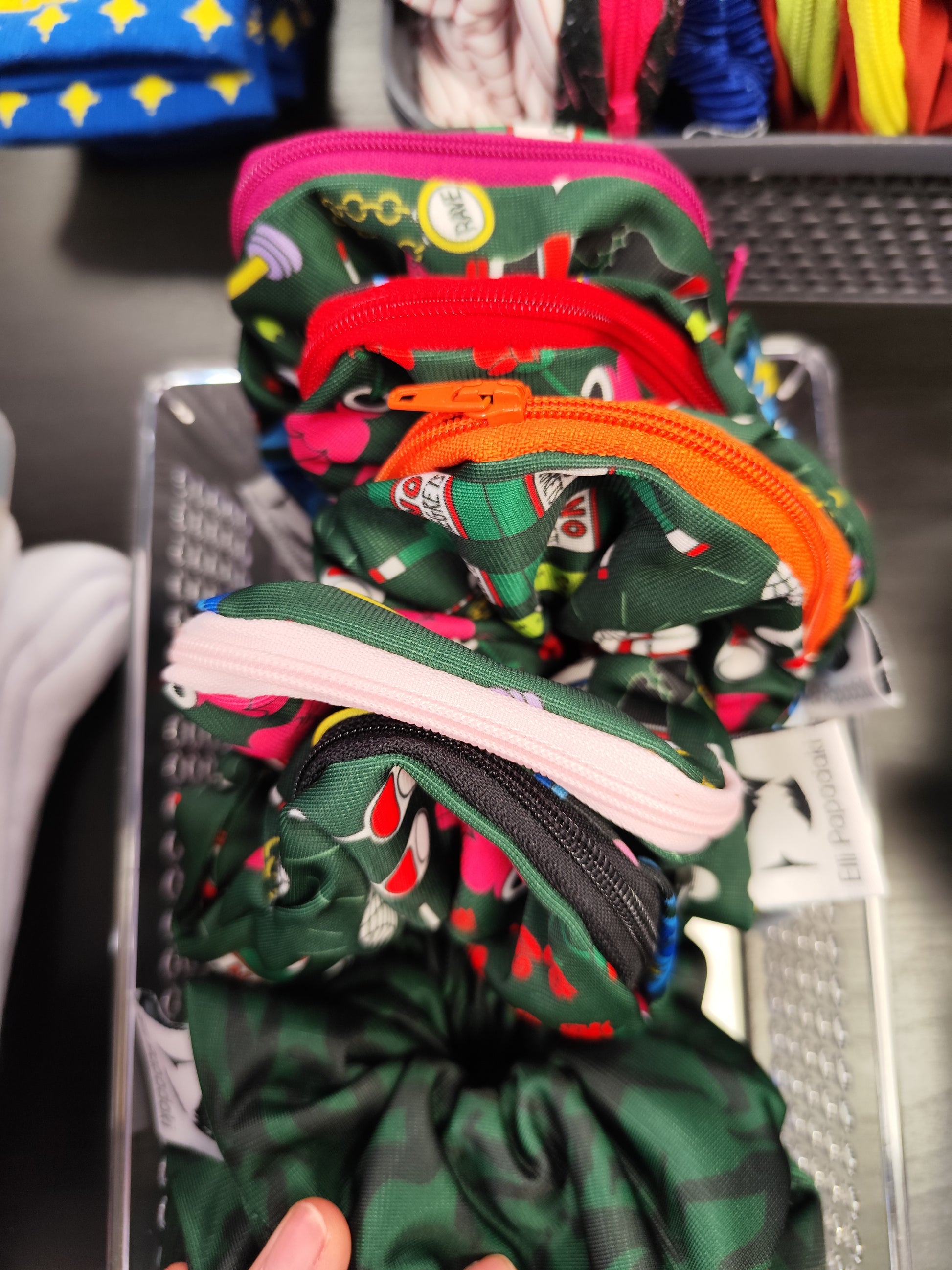 The ultimate accessoire is here and is a scrunchie with a zipper! Put in your coins, your earplugs, your car key and every little thing you may need in a party, an event or just for a walk!