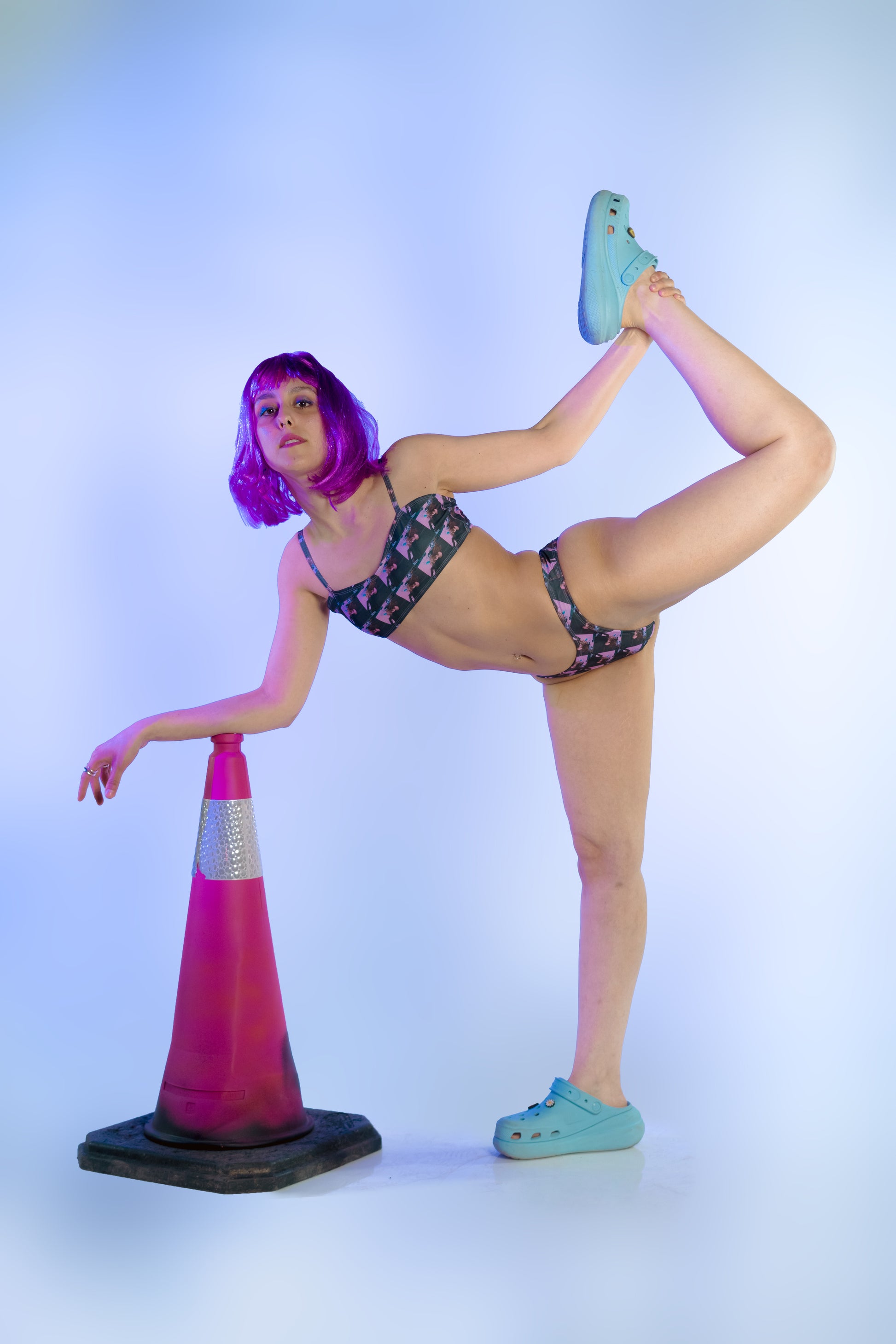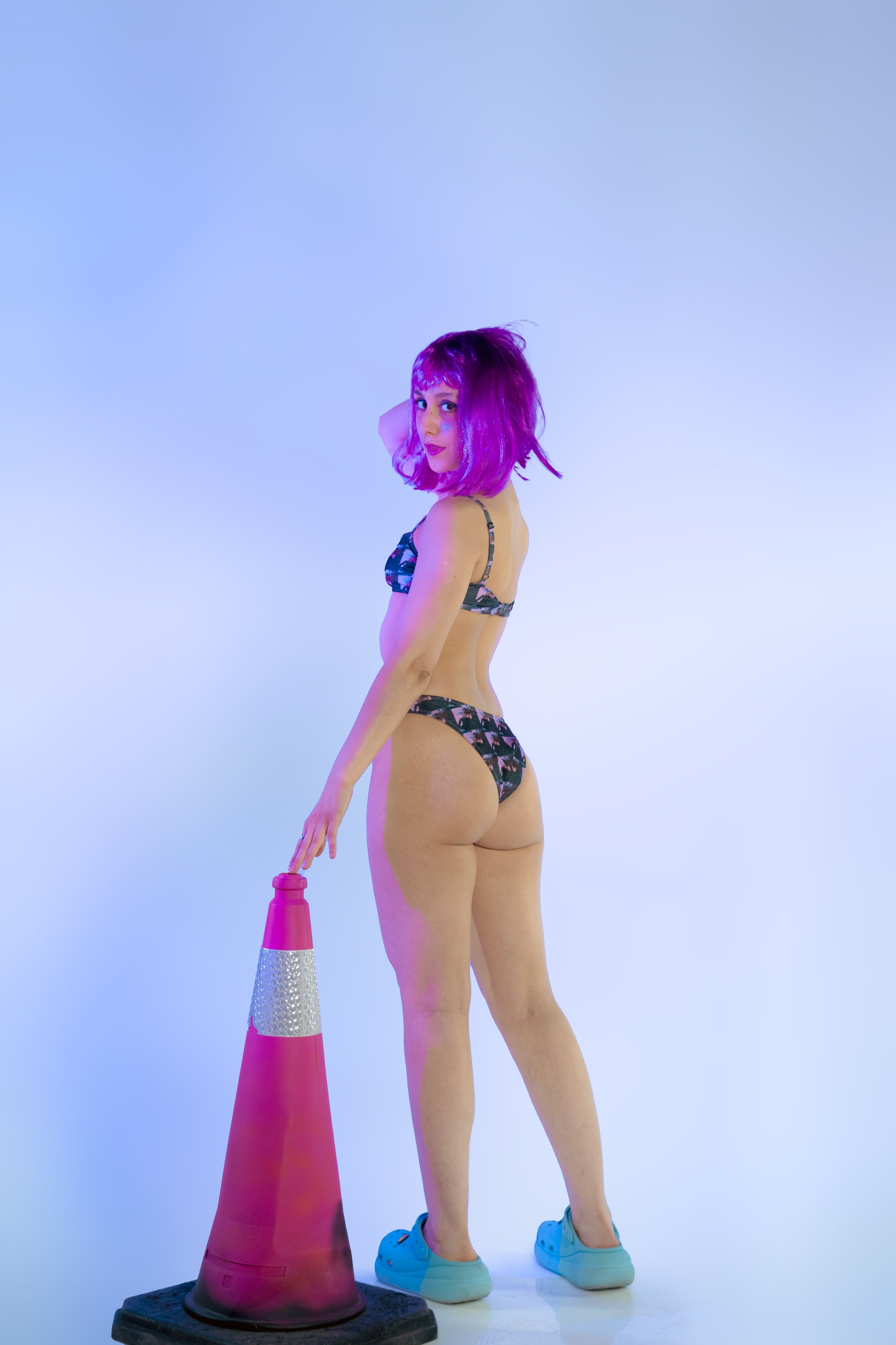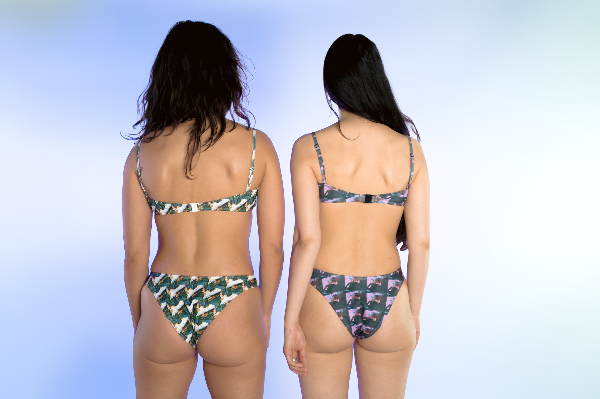 Two-piece swimsuit with a vintage aesthetic and a doll-head print. The print is made out of a dolls' photo found in garbage.