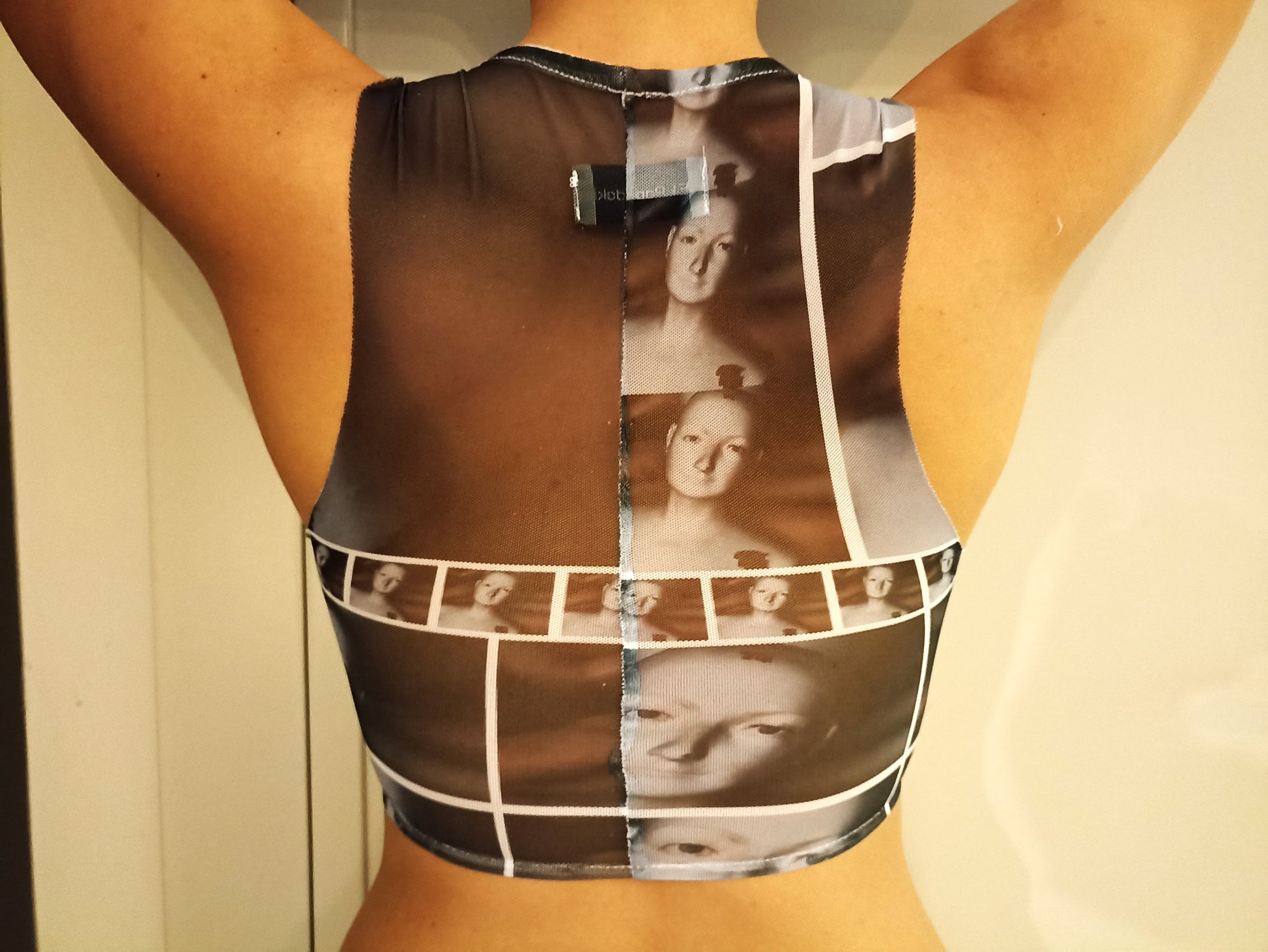 Sleeveless sheer top from printed elastic fabric.